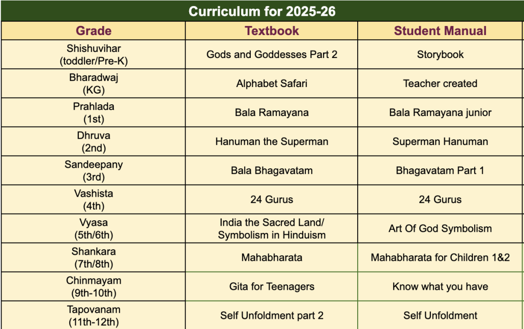 We aim to inspire each one to reach their maximum potential by imparting a value-based education that is bursting with fun-filled activities. Each class follows a central, age-specific curriculum developed by senior Archaryas of the Chinmaya Mission.